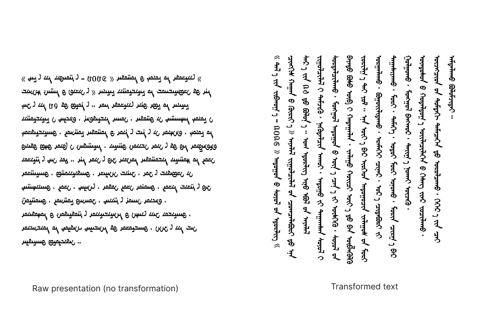 If you just rotated a paragraph 90 degrees, the lines would stack from right-to-left (like Chinese) or bottom-to-top, which is wrong for Mongolian. The Matrix hack is necessary because it fundamentally redefines how the browser calculates “next line” and “next letter.